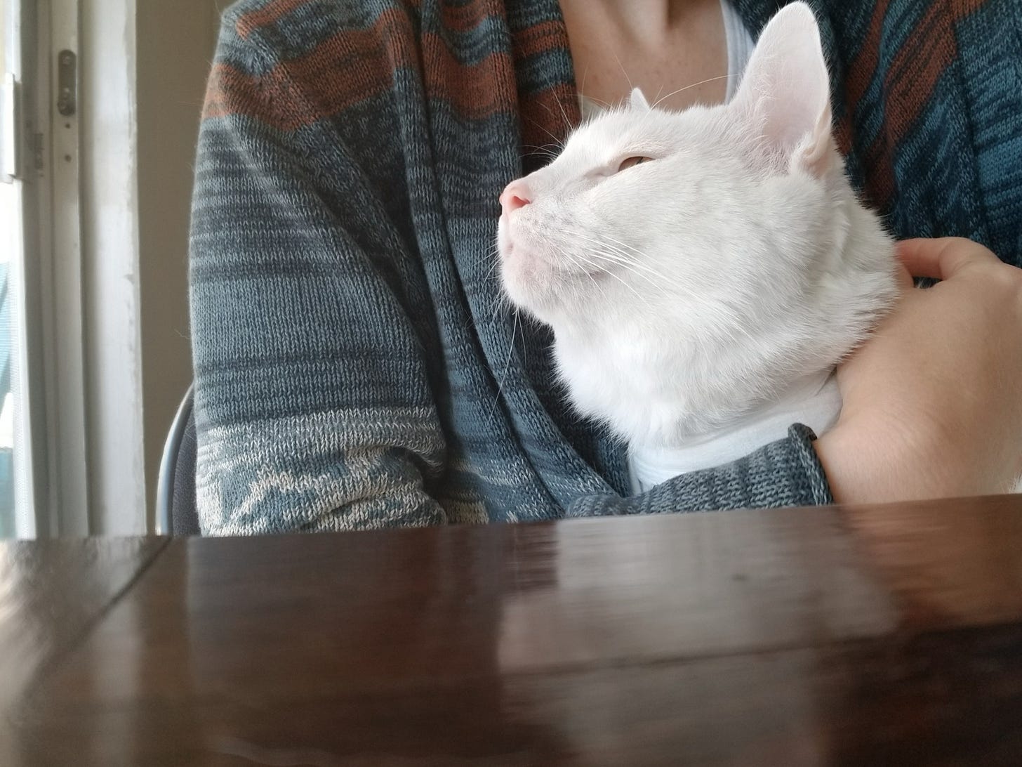I’ve been saying I lost my cat. He is lost to me. He was here in my lap, cuddling and purring, and now he is not.